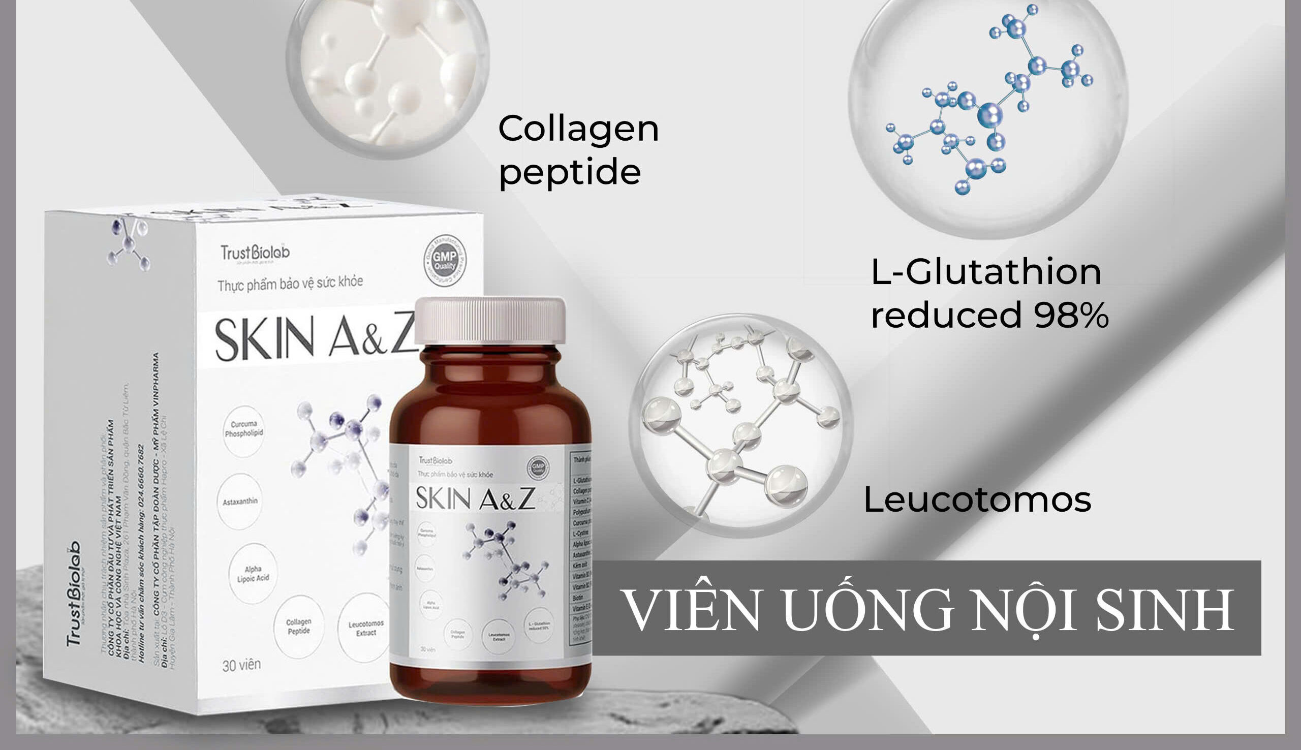 - Hỗ trợ làm tăng đàn hồi, tăng độ ẩm cho da, hỗ trợ chậm lão hóa: Cùng với L-Glutathione 98% (độ tinh khiết 98%), Collagen peptide (Collagen thủy phân), Curcuma Phospholipid, Astraxathin 20%, Alpha Lipoic Acid, Niaciamine, … là sự kết hợp hoàn hảo tạo nên một giải pháp đẩy lùi lão hóa của SKIN A&Z với 3 tác động: ức chế các tác nhân gây lão hóa da thông qua cơ chế ức chế các sản phẩm glycat hóa AGEs (Advanced Glycation End Products); ức chế men tiêu hủy cấu trúc nền MMPs (Matrix Metalloproteinases); loại bỏ gốc tự do ROS (Reactive Oxygen Species) và cải thiện khả năng sửa chữa DNA của các tế bào giúp bảo vệ và tái tạo làn da tươi trẻ, trắng sang, làm chậm lão hóa da.