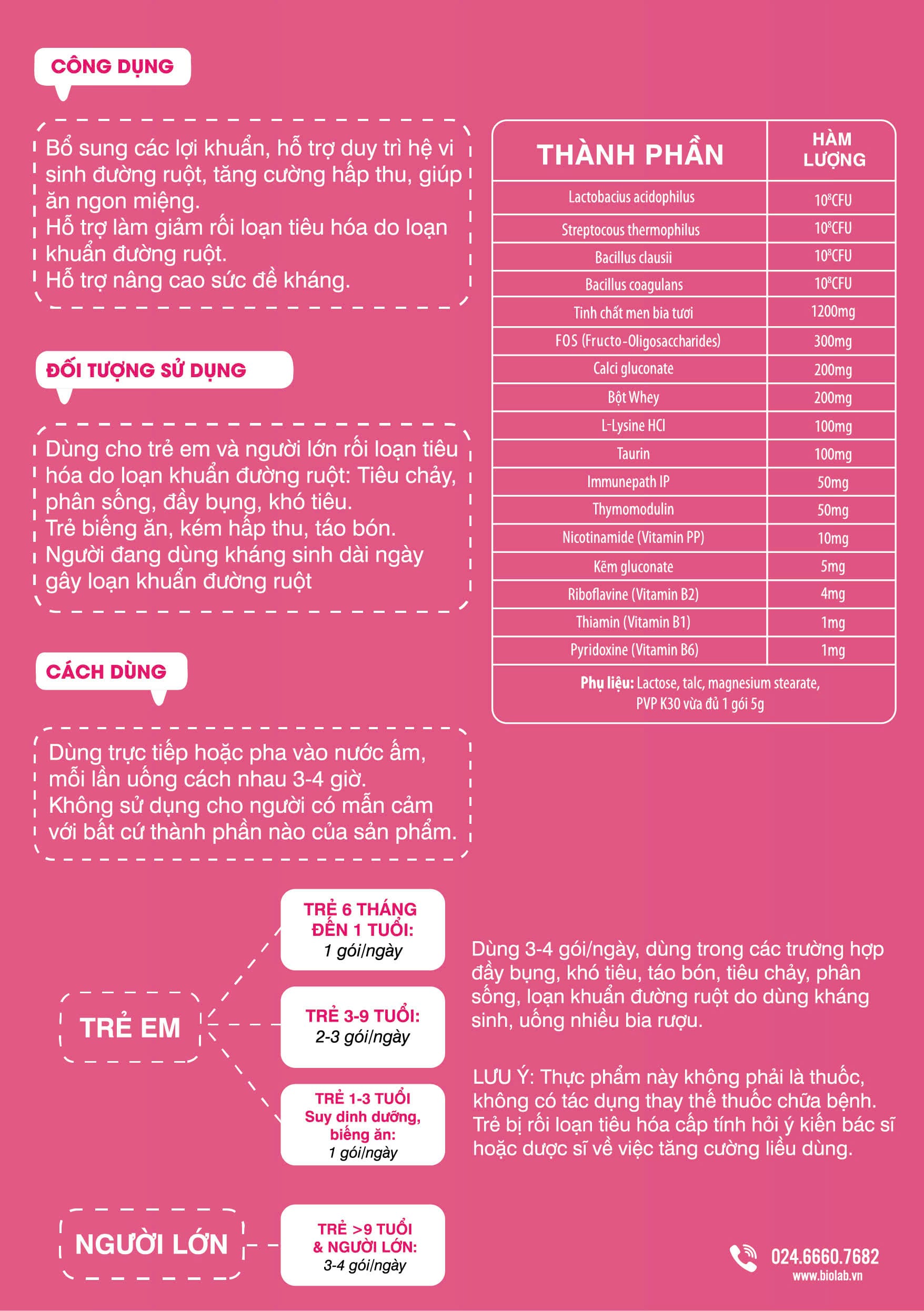 Lactobacilus acidophilus 108CFU; Streptococus thermophilus 108CFU; Bacillus clausii 108CFU; Bacillus coagulans 108CFU; Tinh chất men bia tươi 1200mg; FOS (Chất xơ hòa tan) 300mg; Calci gluconate 200mg; Bột Whey 200mg; L-Lysine HCl 100mg; Taurin 100mg; Imunepath IP 50mg; Thymomodulin 50mg; Nicotinamide (Vitamin PP) 10mg; Kẽm gluconate 5mg; Riboflavine( Vitamin B2) 4mg; Thiamin C (Vitamin B1) 1mg; Pyridexine (Vitamin B6) 1mg